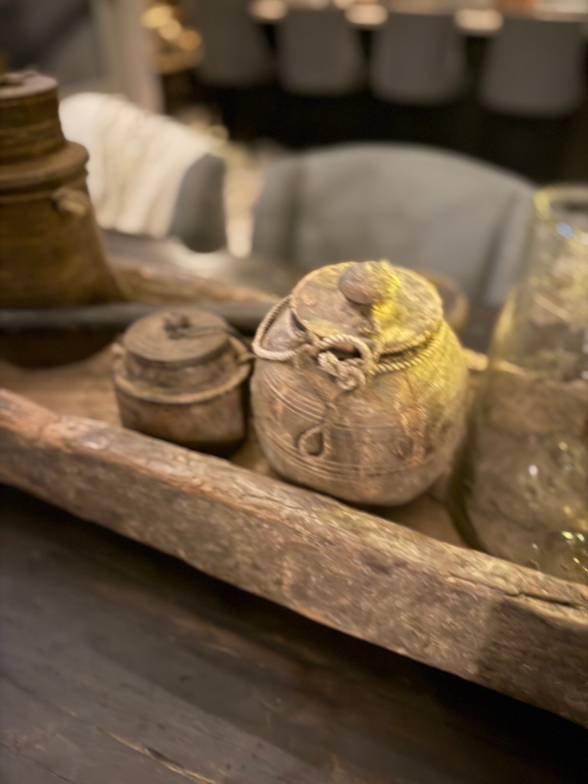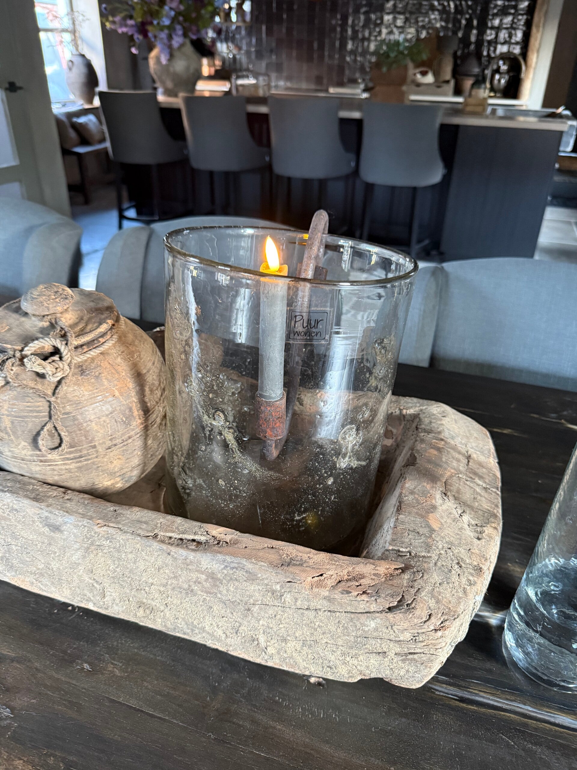 Prachtige robuuste stoere houten trog om mee te decoreren op tafel een echte eyecatcher, prachtig met de windlichten van Puur Wonen en natuurlijke materialen zoals mooie takken, artisjokken of kerstversieringen.